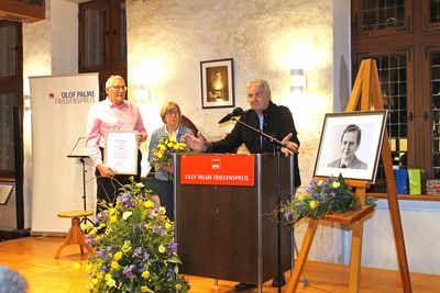 Die Vorschläge für den Olof-Palme-Friedenspreis waren vielfältig und ehrenwürdig, berichtete Probst i. R. Matthias Bohl über die Auswahlentscheidung des Kuratoriums. So wurden der »Runde Tisch Trittau«, der für ein offenes und tolerantes Trittau steht, der »Kraken Stormarn hilft e.V., der unter anderem das Kinder-Hospiz Sternenbrücke unterstützt, die Berufsschülerin Celina Kühn, die sich über Tampon- und Bindenspender für Chancengleichheit einsetzt und Alice Freitag, die die Lesepaten Ahrensburg organisiert, vorgeschlagen. Den Preis erhielt jedoch der Verein »Bunte Vielfalt Bargteheide Stadt und Land e.V.« für seine mittlerweile zehnjährige engagierte Beratung, Betreuung und Begleitung Geflüchteter. Der Laudator hob die Verlässlichkeit, die offene Anlaufstelle, die praktischen Hilfen und die menschliche Wärme des Vereins als besonders zu ehren hervor. Sie bieten Workshops und Lernangebote an, eine Fahrradwerkstatt und eine Nähstube wie auch Begegnungsräume und ein Frauencafé. Zudem sind persönliche Begleitungen wie auch Fahrdienste möglich. Ausflüge gehören ebenso zum Angebot des Vereins. Die Unterstützung stärkt die Selbständigkeit der Menschen, schafft Vertrauen und soll helfen, ein Leben in Bargteheide aufzubauen.